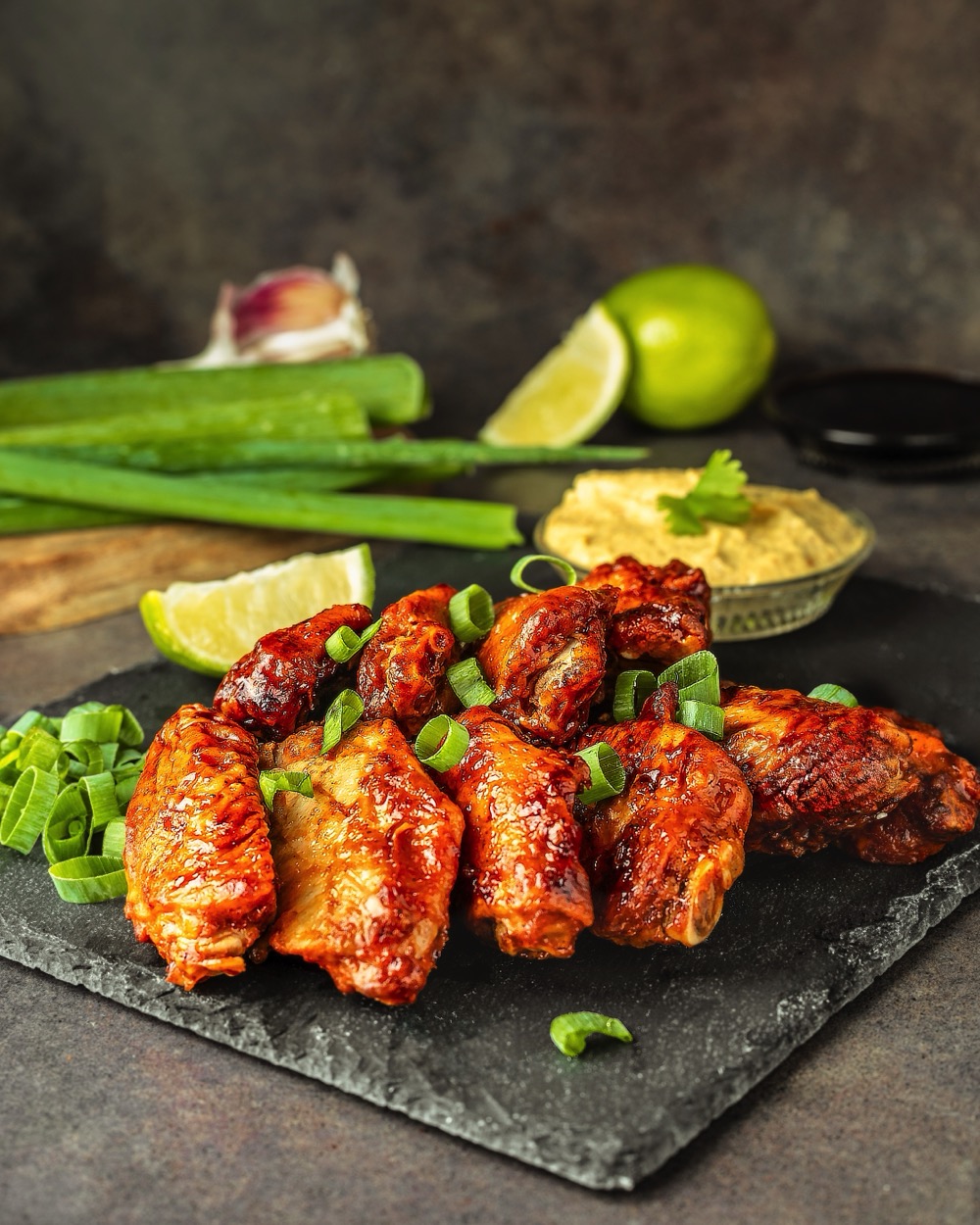 Ingredients: Chicken wings, water, sugar, salt, rice starch, spices, yeast extract, dried glucose syrup, garlic powder, onion powder, modified maize starch, maize starch, caramelised sugar, spice extracts, acidity regulators (E331,E500), maltodextrin, smoke flavouring, stabiliser (E451), natural flavouring.