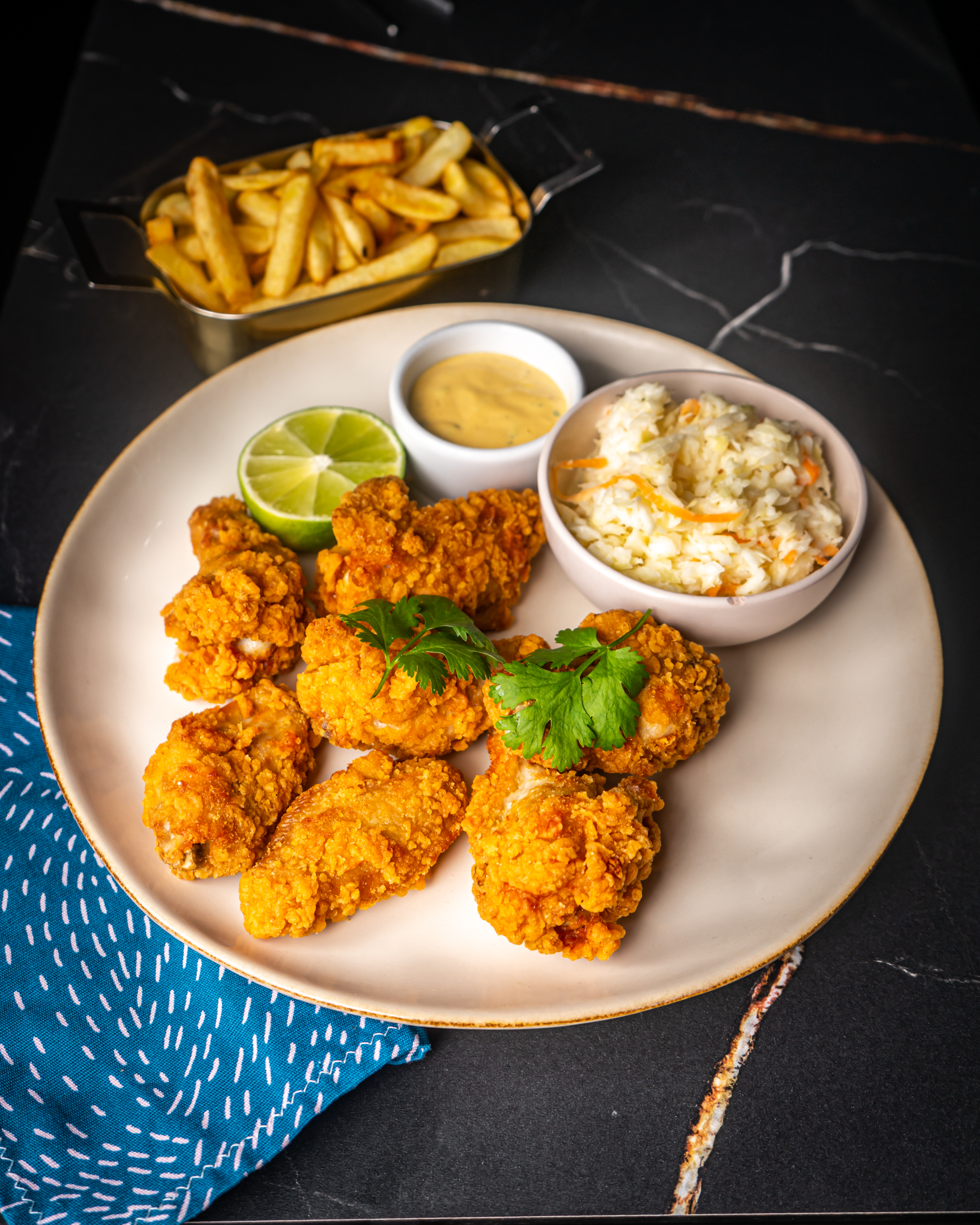 Chrupiące, pikantne skrzydełka w złocistej panierce, podane z kremowym sosem mango z nutą świeżej kolendry. Do tego klasyczny coleslaw i grubo krojone frytki stekowe. Kompozycja, która łączy ostrość, świeżość i chrupkość w street-foodowym stylu.